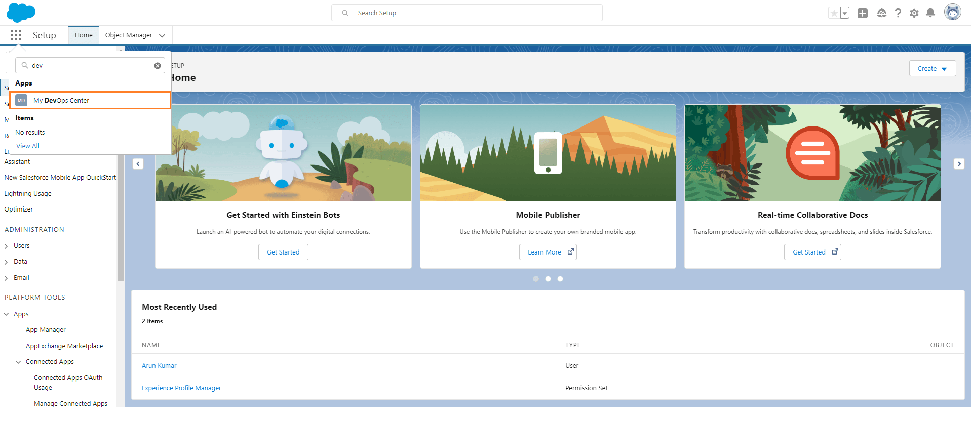 - From Setup, enter DevOps Center in the Quick Find box, then select DevOps Center.